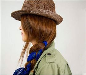4、一直編到發(fā)尾,用較長(zhǎng)的絲巾代替橡皮筋將發(fā)尾系緊。戴上一頂草帽,就能美美的出游拍照了!