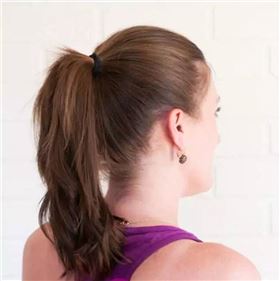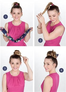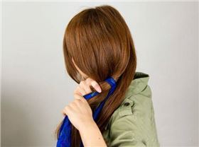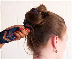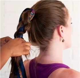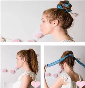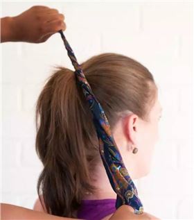 1、扎起高馬尾,將絲巾旋轉(zhuǎn)擰成絲帶狀,系在馬尾頂端。