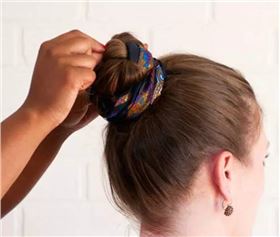 絲巾扭轉(zhuǎn)折起,就變成了發(fā)帶,不論是盤發(fā)還是披肩發(fā),都很搭。